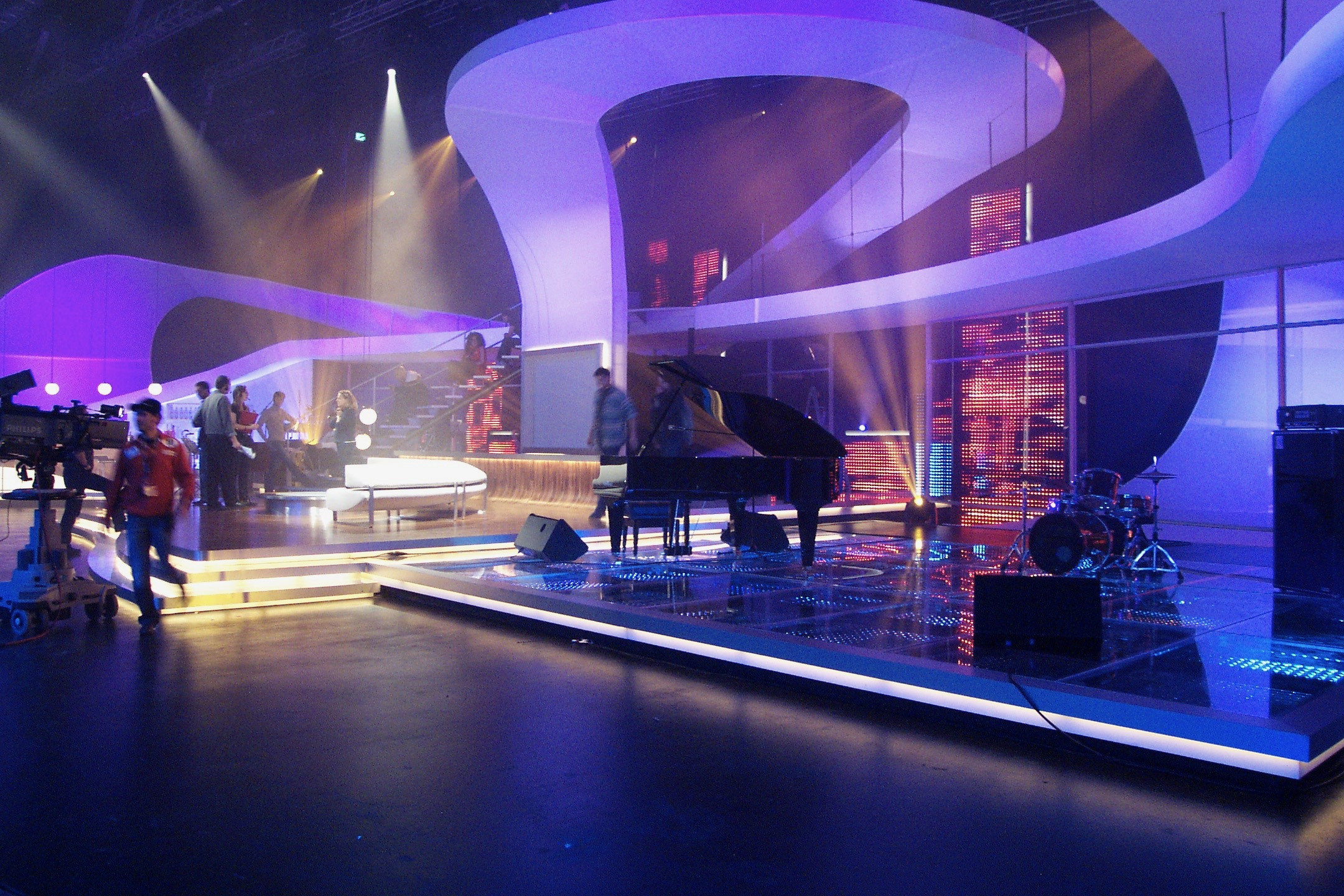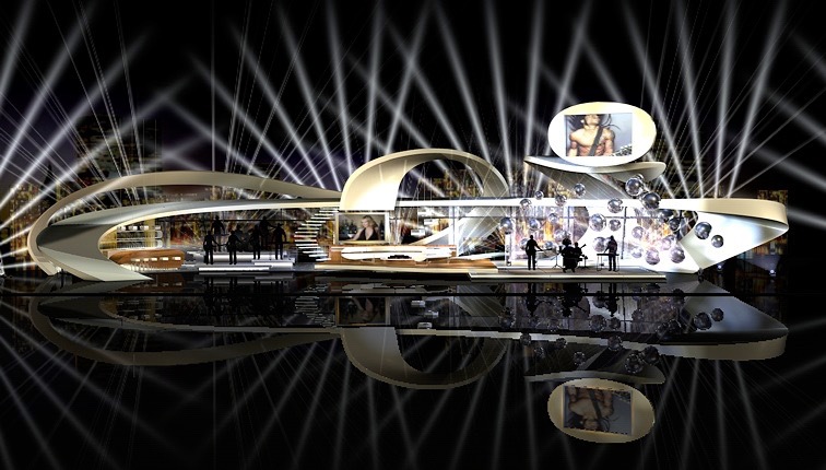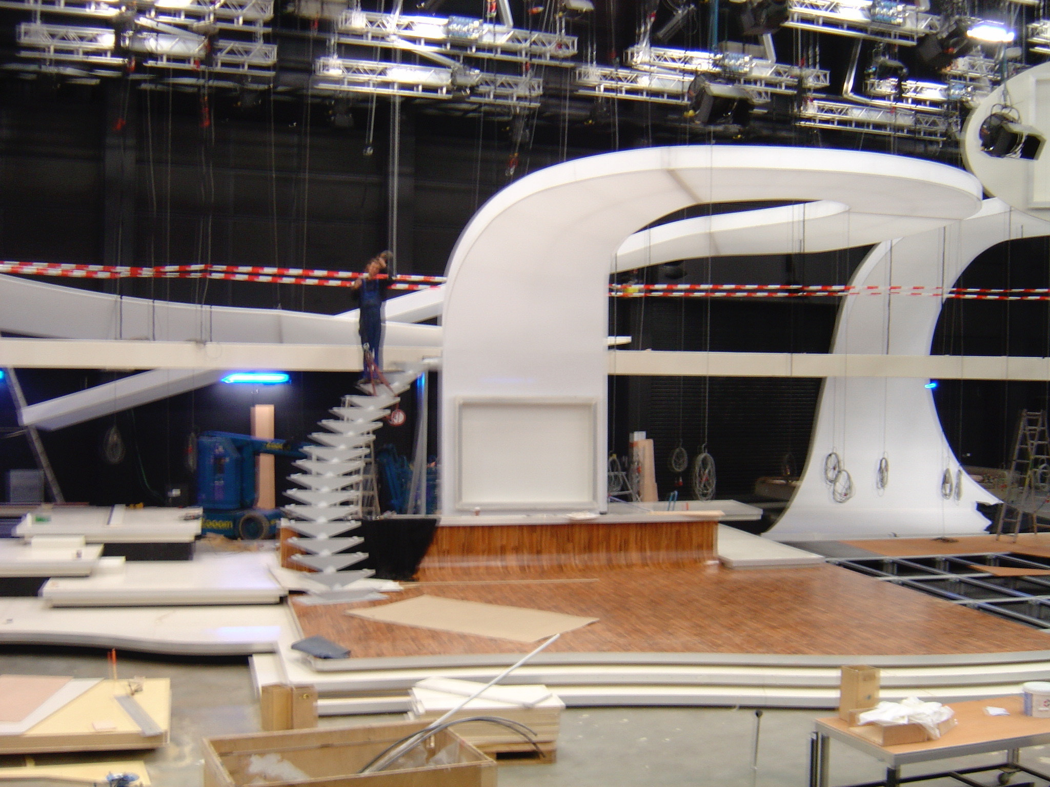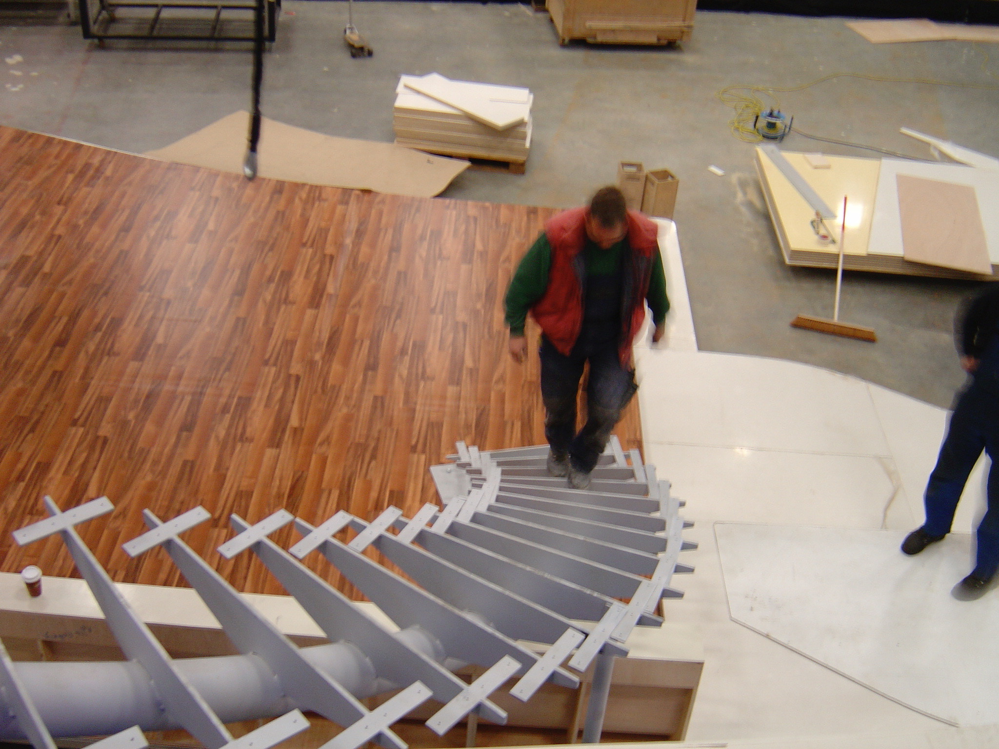 Geschwungene Rampe und gedrehte Treppe für aufwendige Bühnenkonstruktion. Besonderheit: es standen nur 10 Tage Bauzeit zur Verfügung.