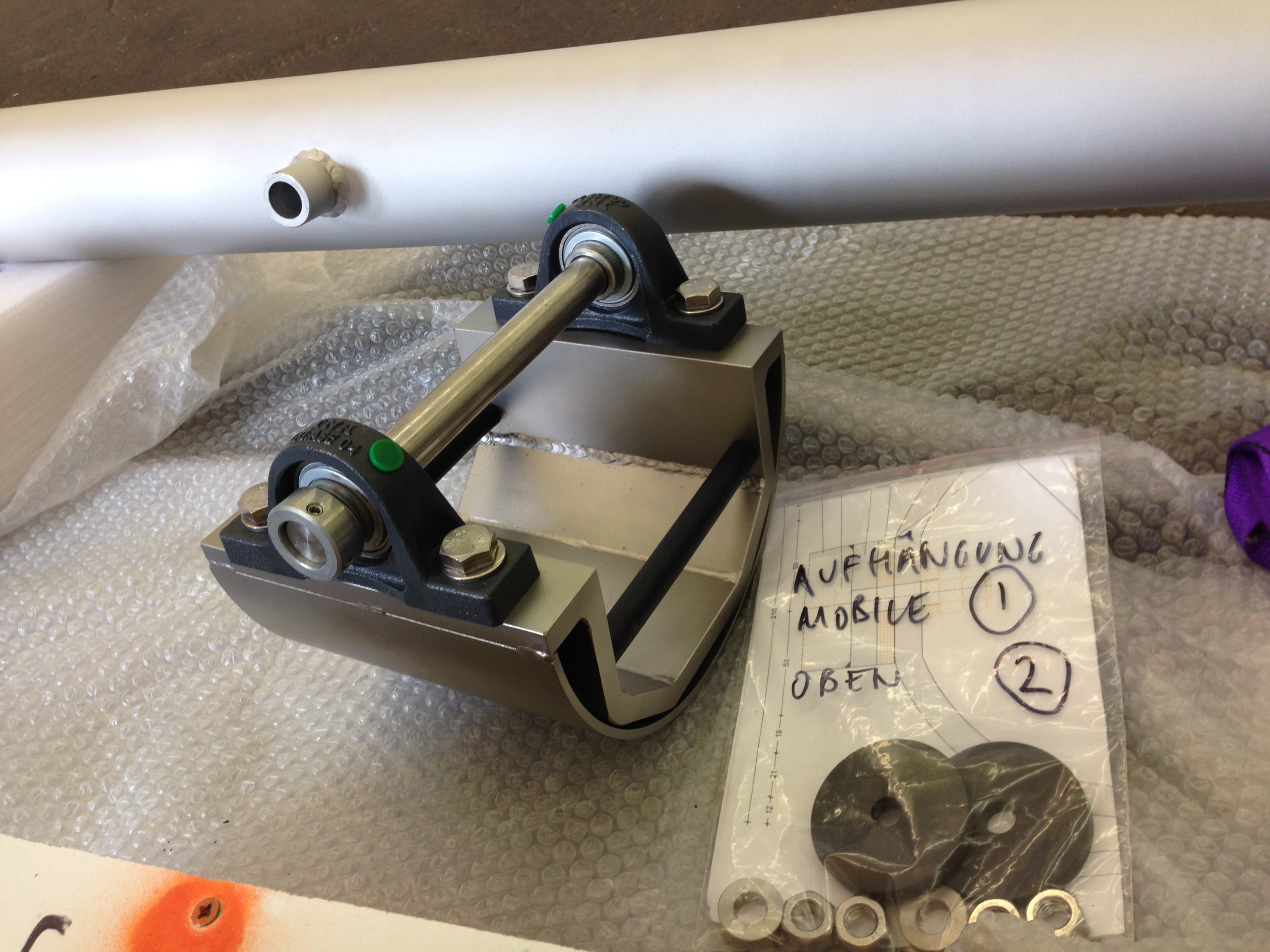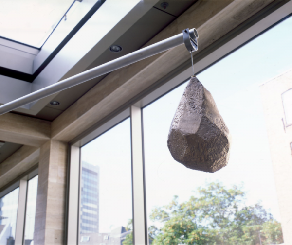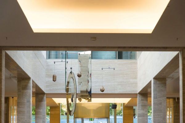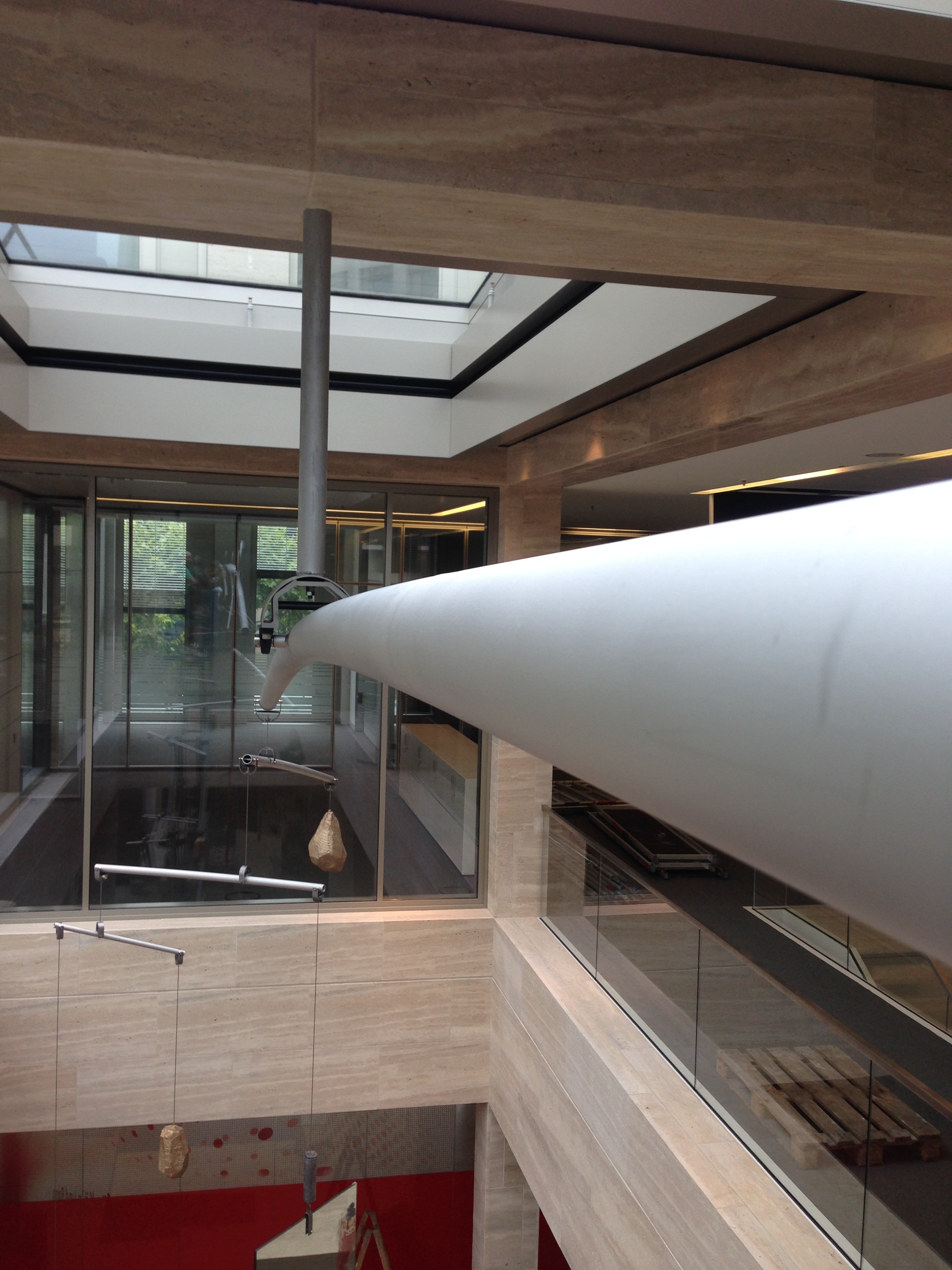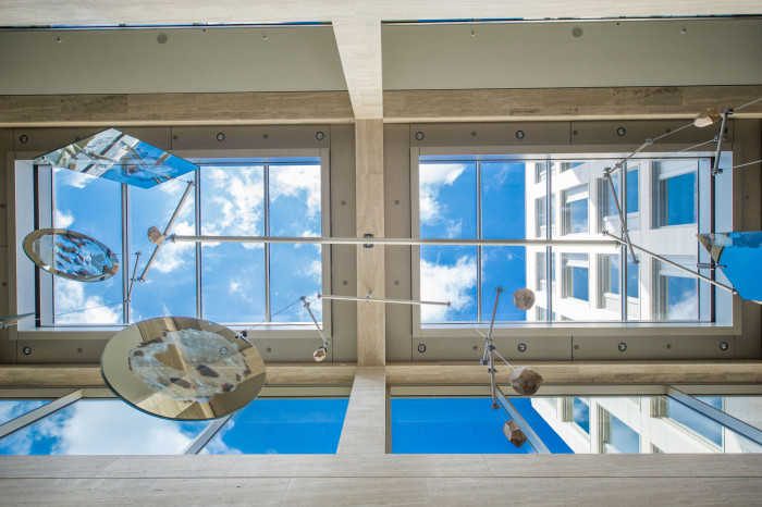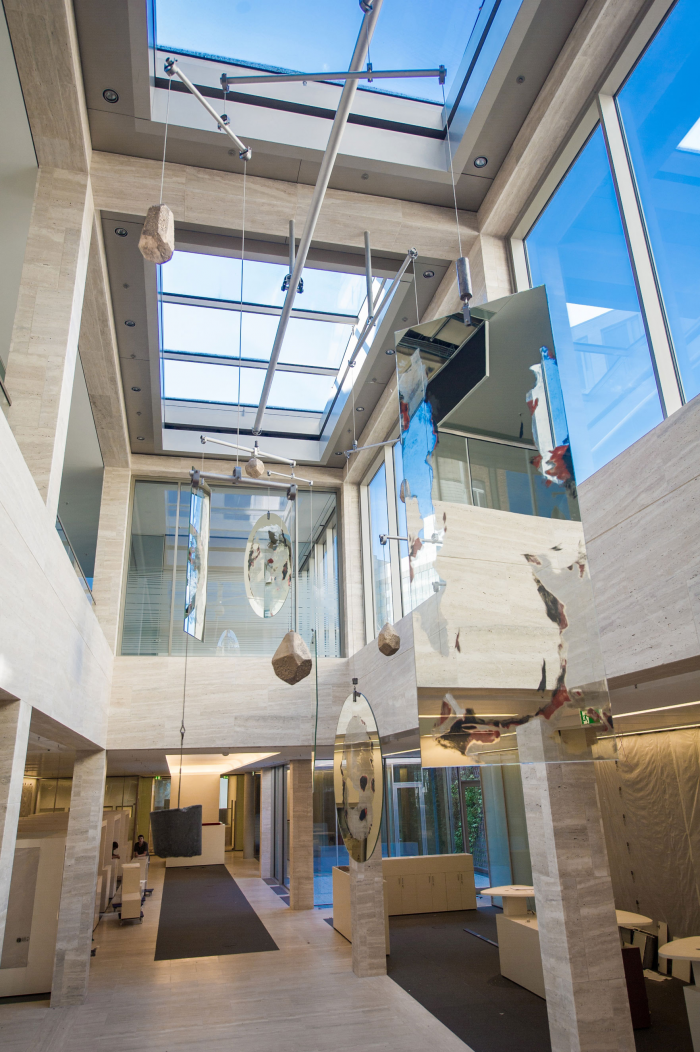 Mobile von Gereon Krebber für die Sparkasse Bonn, Neubau Hauptstelle Friedensplatz. Metall, Spiegel, Beton, 1kg Gold, Zweiteilig.