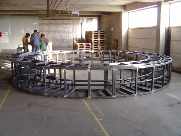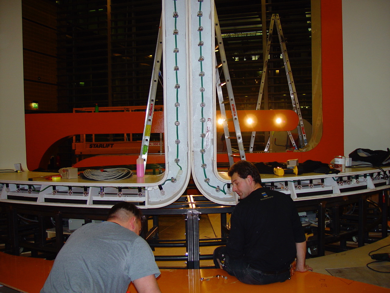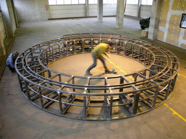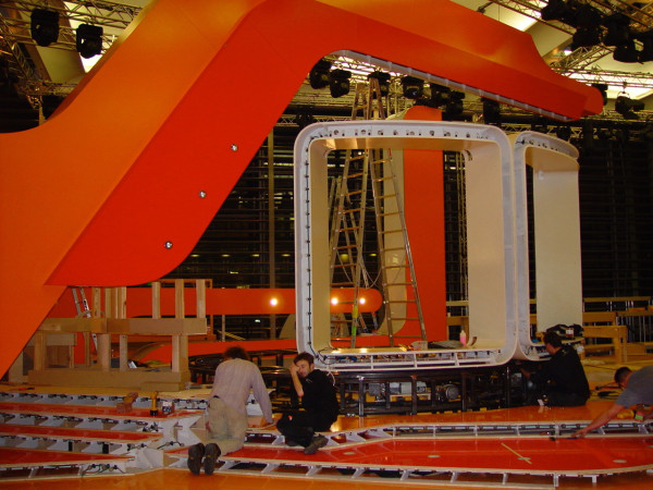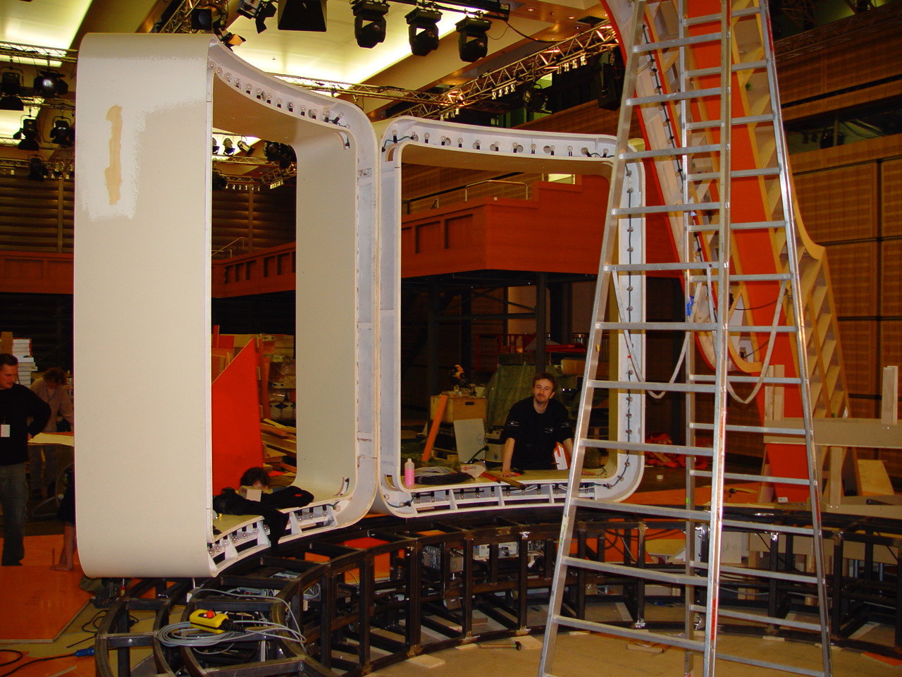 Ringförmige Stahlkonstruktion mit motorisch betriebenen Schlitten für Lichtwände. Bühnenelement für Fernsehshow "Ein Herz für Kinder";
