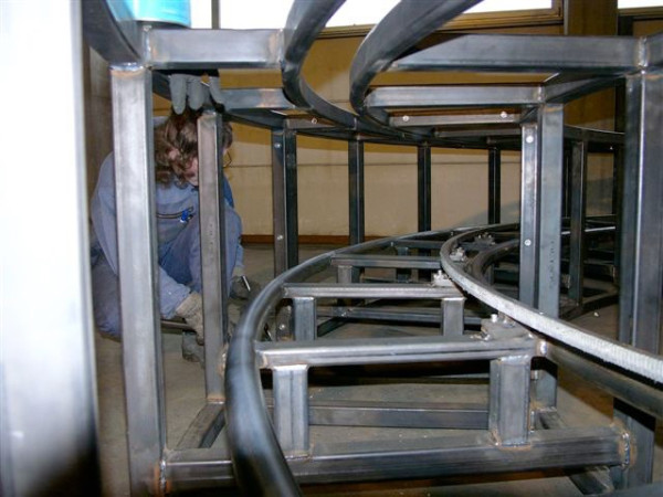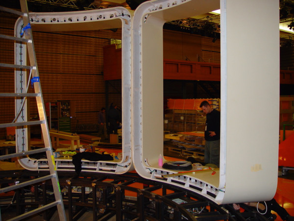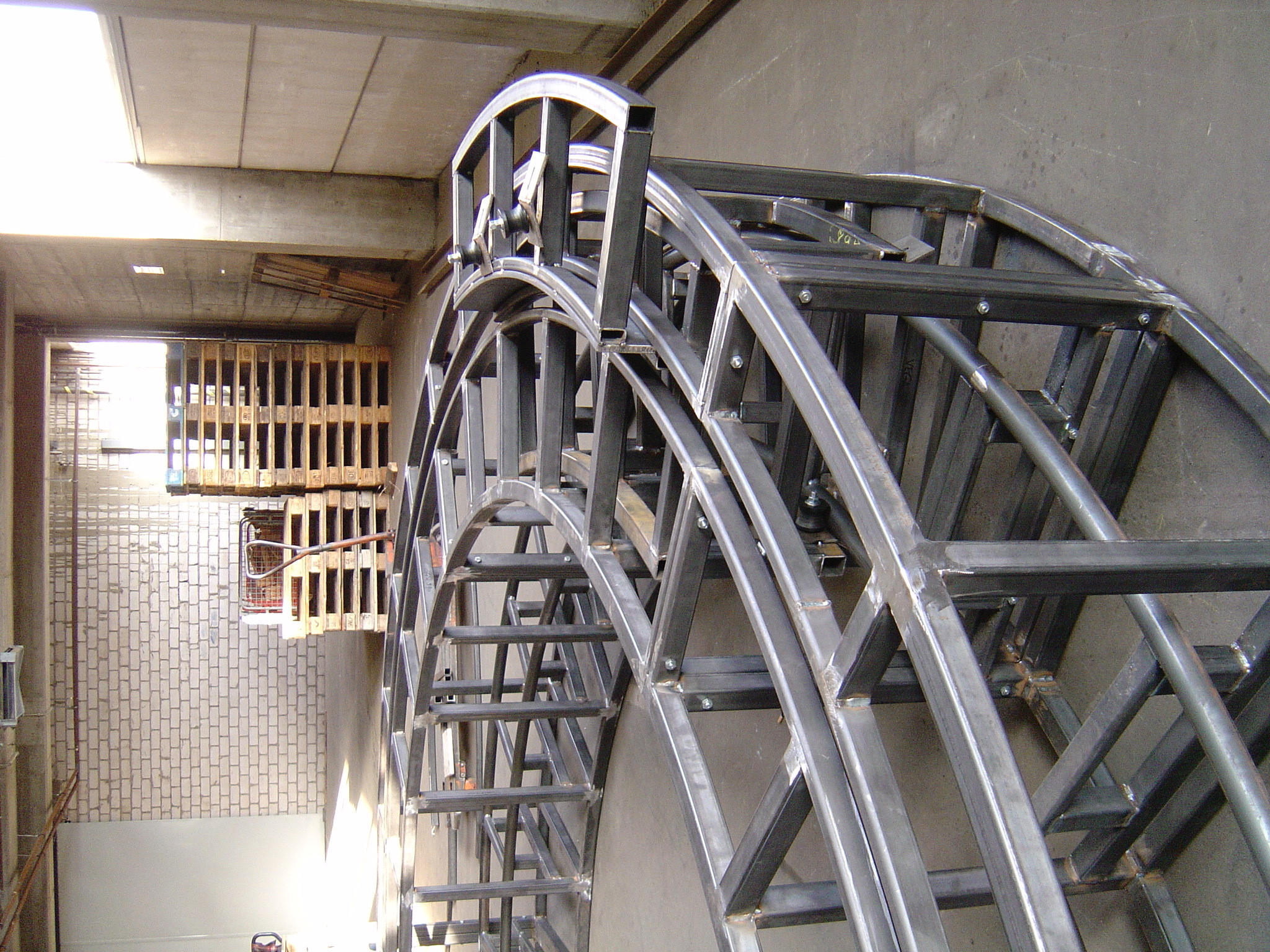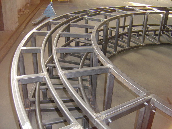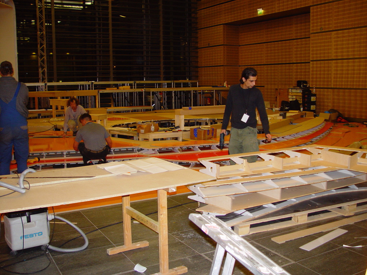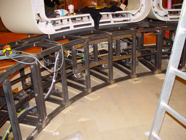 Ringförmige Stahlkonstruktion mit motorisch betriebenen Schlitten für Lichtwände. Bühnenelement für Fernsehshow "Ein Herz für Kinder";