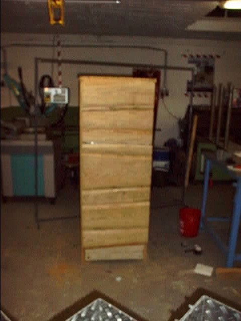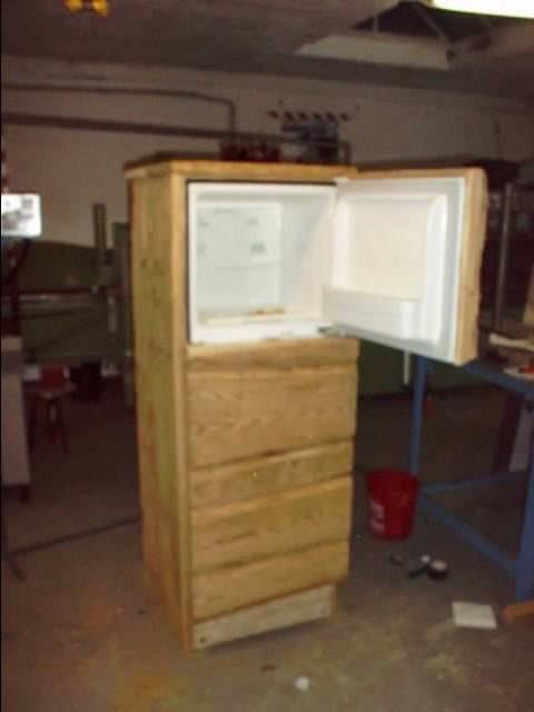 Kühlschrank für "Verstehen Sie Spaß". Verlade des Fernsehkochs Johann Laufer. Alle Fächer und inneren Teile des Kühlschranks konnten per Knopfdruck zum Einsturz gebracht werden. Laufer verzweifelte.