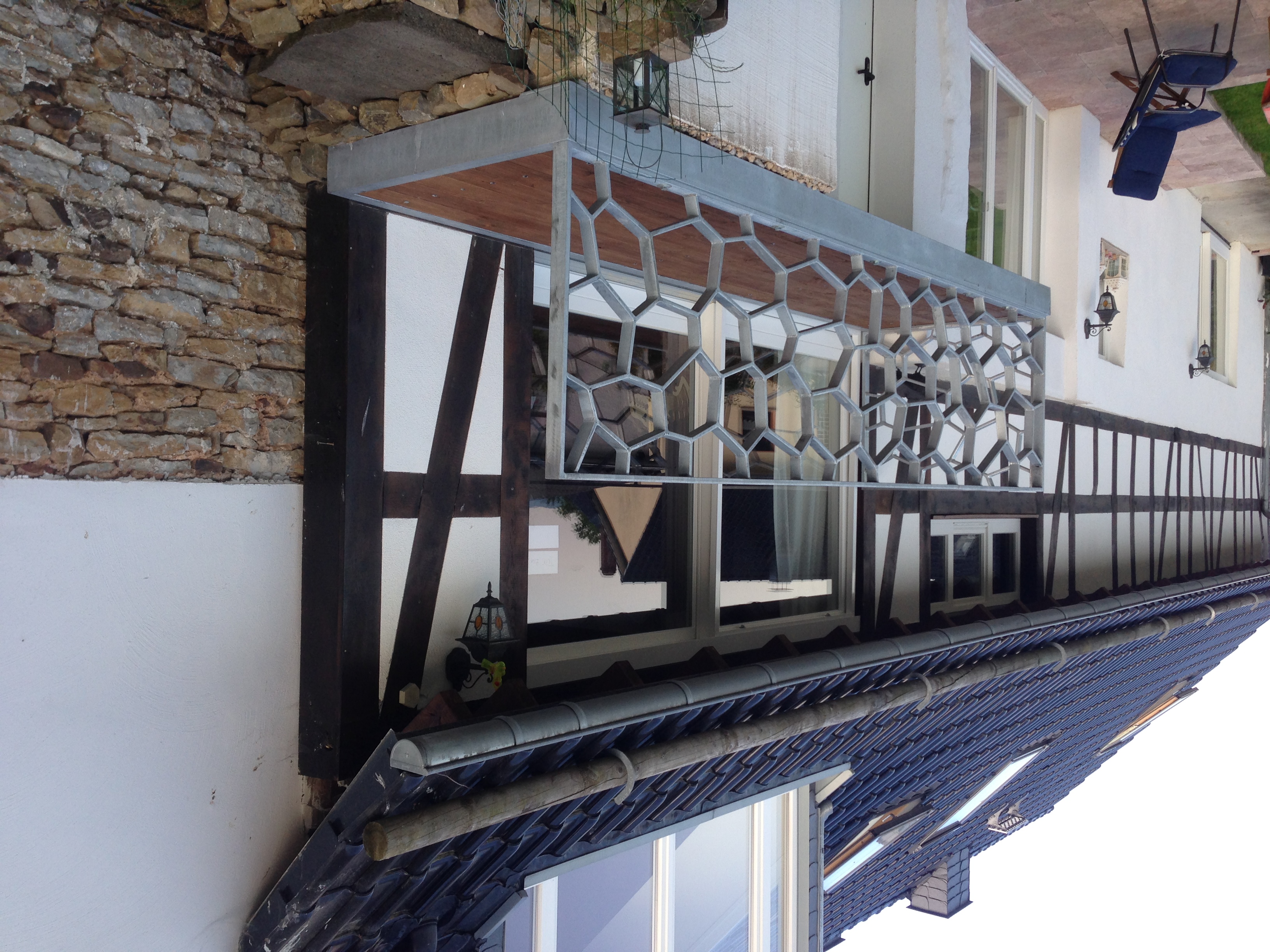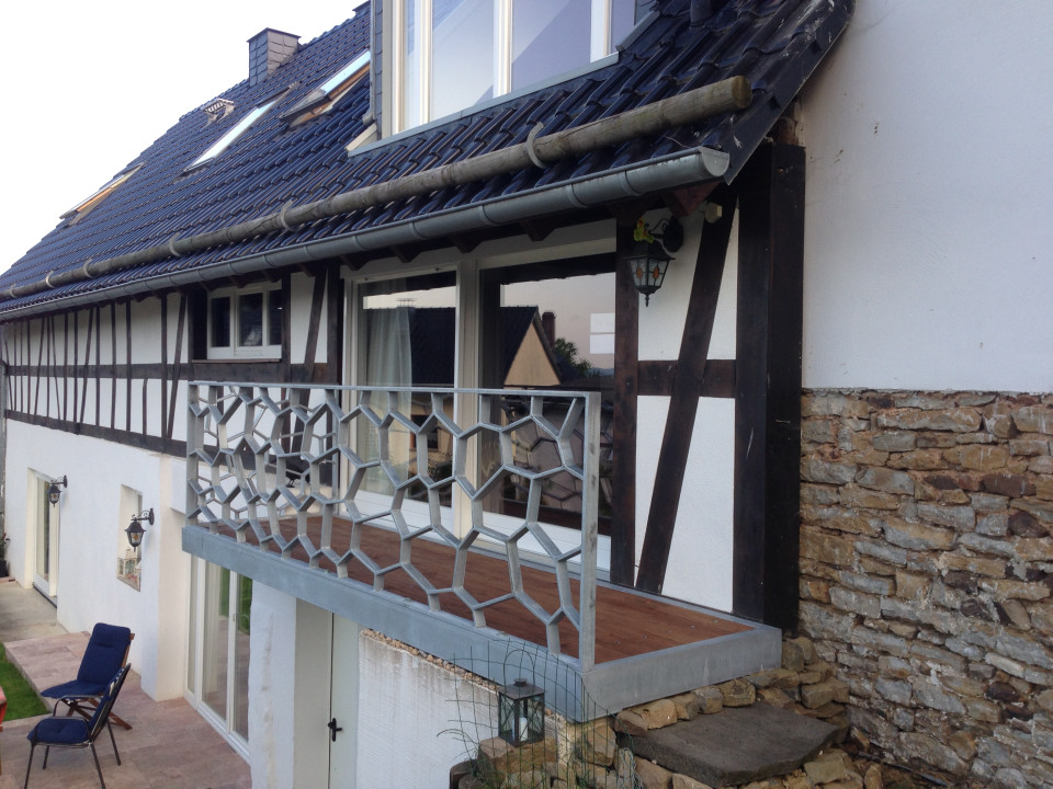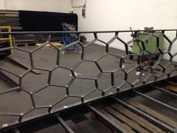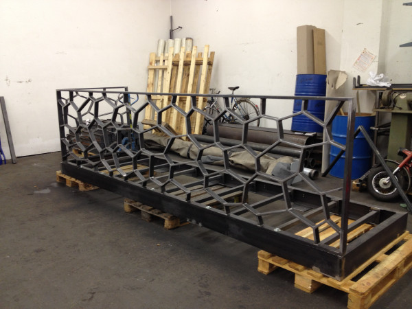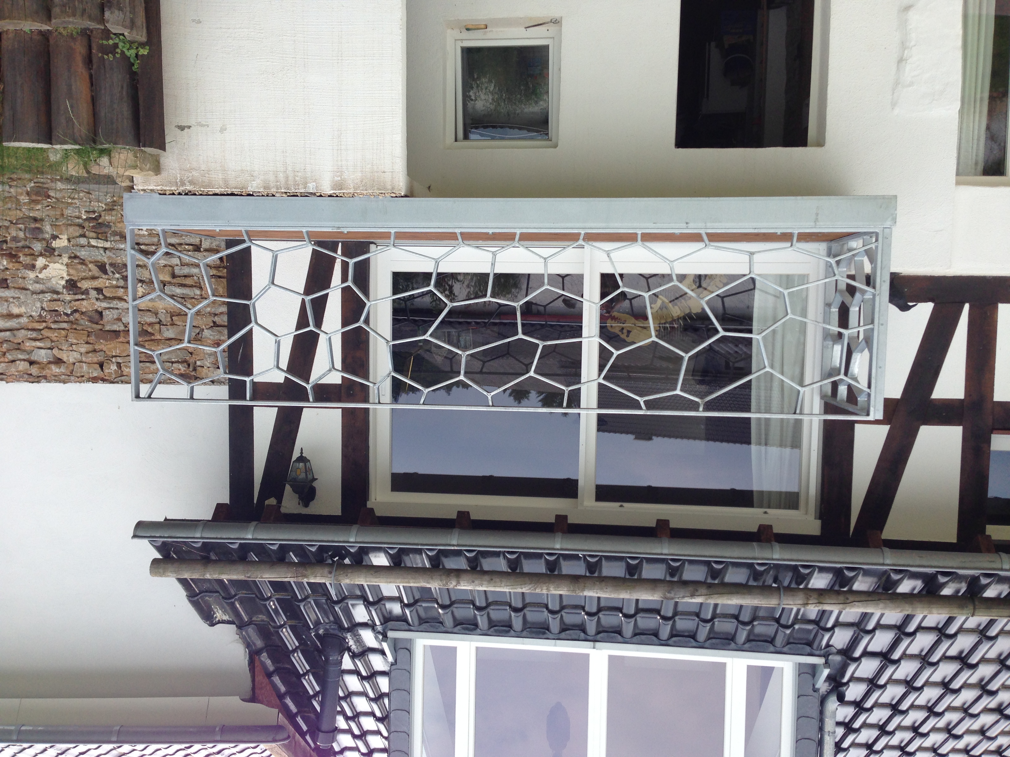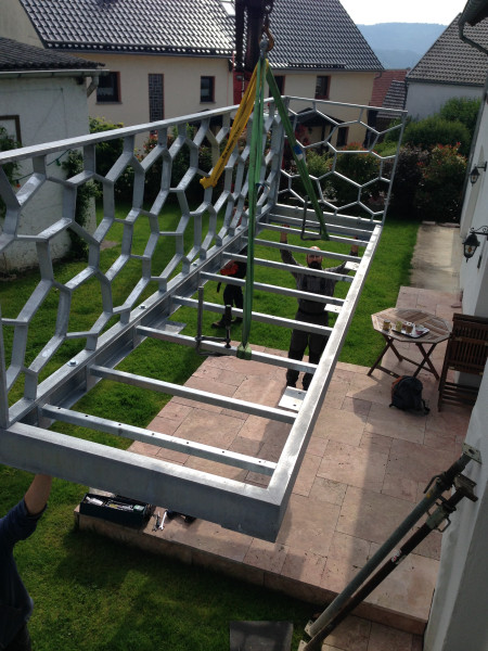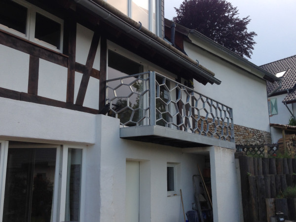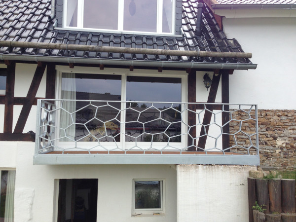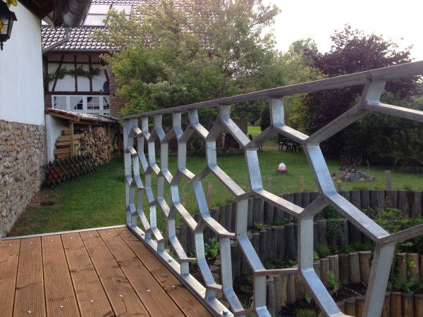 Balkongeländer in Form eines Voronoi-Diagramms aus verzinktem Stahl.