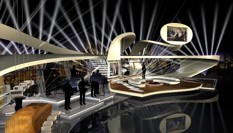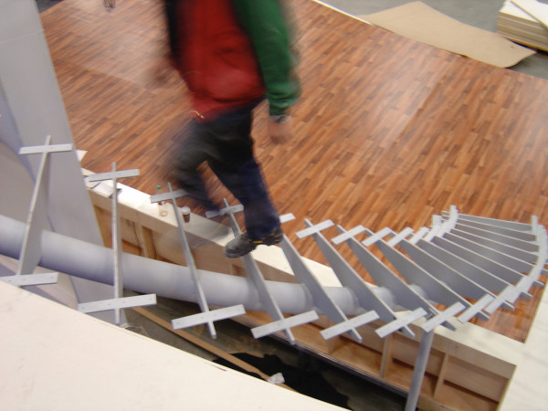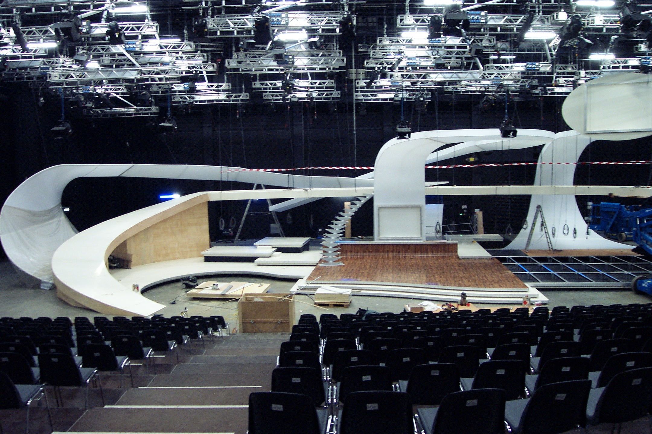 Geschwungene Rampe und gedrehte Treppe für aufwendige Bühnenkonstruktion. Besonderheit: es standen nur 10 Tage Bauzeit zur Verfügung.