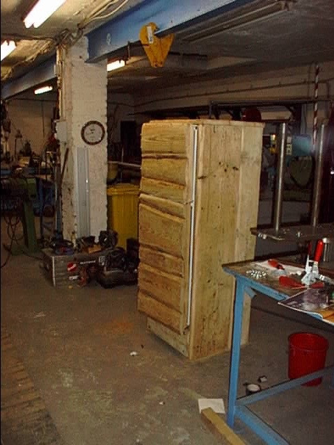 Kühlschrank für "Verstehen Sie Spaß". Verlade des Fernsehkochs Johann Laufer. Alle Fächer und inneren Teile des Kühlschranks konnten per Knopfdruck zum Einsturz gebracht werden. Laufer verzweifelte.